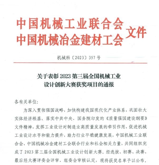 天下机械工业设计立异大赛由中国机械工业团结会、中国机械冶金建材工会团结主理,,,,,大赛以“设计立异、智造未来”为主题,,,,,旨在深入贯彻强国战略,,,,,加速构建我国现代化工业系统,,,,,牢靠壮大实体经济基本,,,,,施展工业设计对制造业高质量生长的牵引作用,,,,,增进机械工业设计水平和能力提升,,,,,助力行业平稳康健生长。。。。。。。。