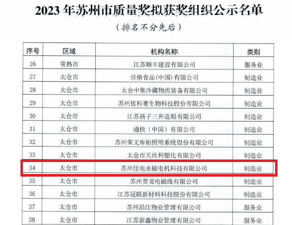 克日,,,,,,,苏州市质量奖评定委员会公示2023年苏州市质量奖评定效果,,,,,,,苏州优德88官网网站永磁电机科技有限公司(以下简称“苏州优德88官网网站”)依附着在战略妄想、焦点手艺构建、谋划理念、质量系统等方面的优异体现,,,,,,,经由层层严酷评审,,,,,,,获得了质量评定委员会的高度认可,,,,,,,获评“苏州市质量奖”声誉称呼。。。。。