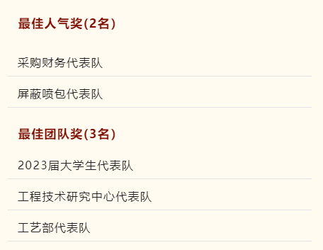 经由强烈角逐,,,,,,,,现场评委通过艺术体现力、行动设计、打扮仪表等五个方面临参赛步队认真考评,,,,,,,,最终产品制造部代表队以最高分获得一等奖,,,,,,,,大型车间代表队、人力经济办公室装备与信息化部代表队获得二等奖,,,,,,,,冲剪车间代表队、电工车间代表队、内贸外贸运维科技代表队获得三等奖,,,,,,,,小型车间代表队、质量包管部代表队获得最佳组织奖,,,,,,,,采购财务代表队、屏障喷包代表队获得最尤物气奖,,,,,,,,2023届大学生代表队、工程手艺研究中心代表队、工艺部代表队获得最佳团队奖。。。。。