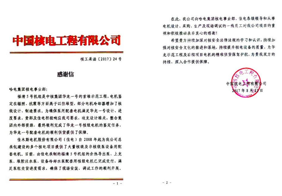 2017年8月23日,,,,,,,,中国核电工程有限公司向哈电集团核电事业部致谢谢信,,,,,,,,对优德88官网网站股份按期包管福清5号机组的电机判断和项目执行给予了充分一定。。。。。。。