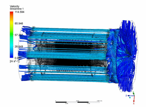 流场仿真优化:使用CFD流体力学仿真软件模拟电机内、外部流场,,,,,对风路结构拓扑优化,,,,,电机散热效率提升25%,,,,,绕组温升降低15K。。。。。。。。