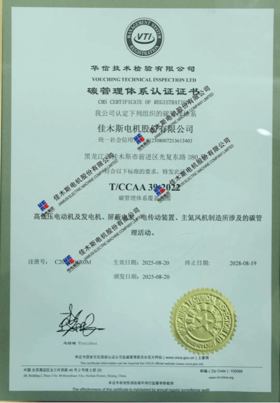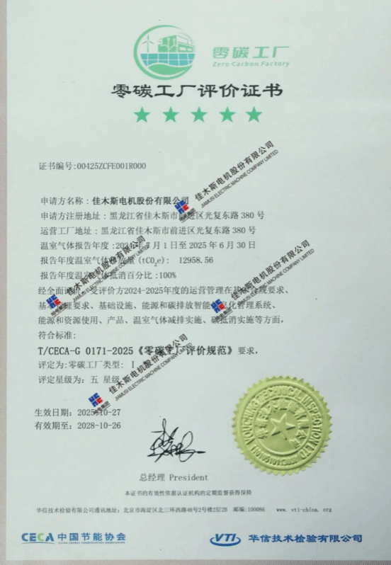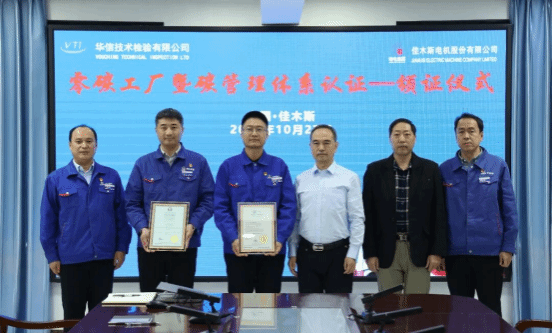 10月27日,,,,, ,,,华信手艺磨练有限公司在哈电集团佳木斯电机股份有限公司(以下简称“优德88官网网站股份”)举行零碳工厂暨碳管理系统认证颁证仪式,,,,, ,,,优德88官网网站股份获评《碳管理系统认证证书》与《零碳工厂评价证书》,,,,, ,,,成为海内电机行业首家通过《零碳工厂评价规范》新标准认证的企业,,,,, ,,,标记着优德88官网网站股份在高端化、智能化、绿色化生长蹊径上迈出的要害一步。。。 。。。。。